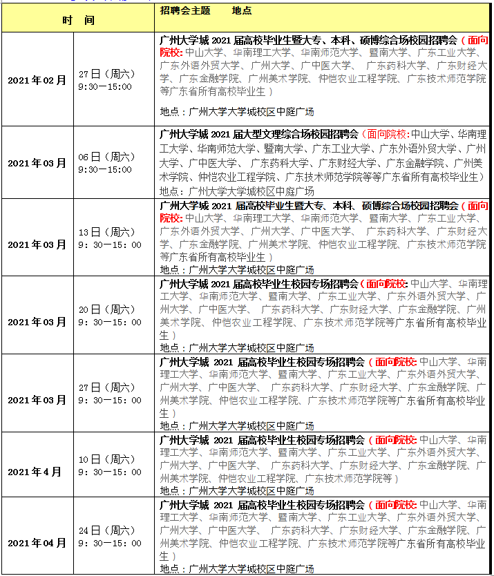 2021年2-4月广东省高校毕业生校园专场招聘会安排表